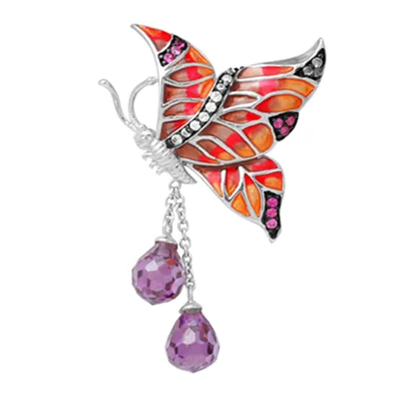 Enamel butterfly pendant with two drops stones dangling
