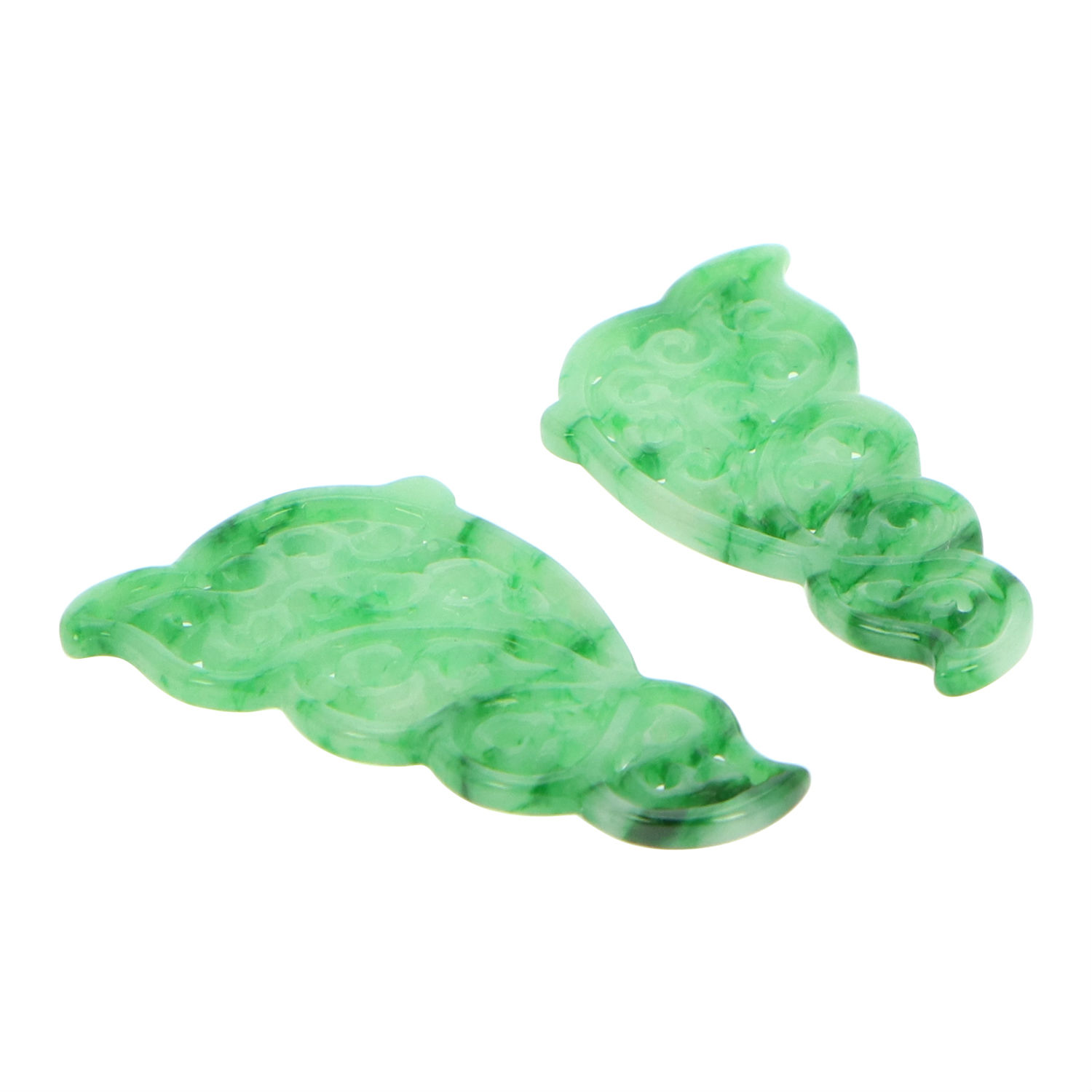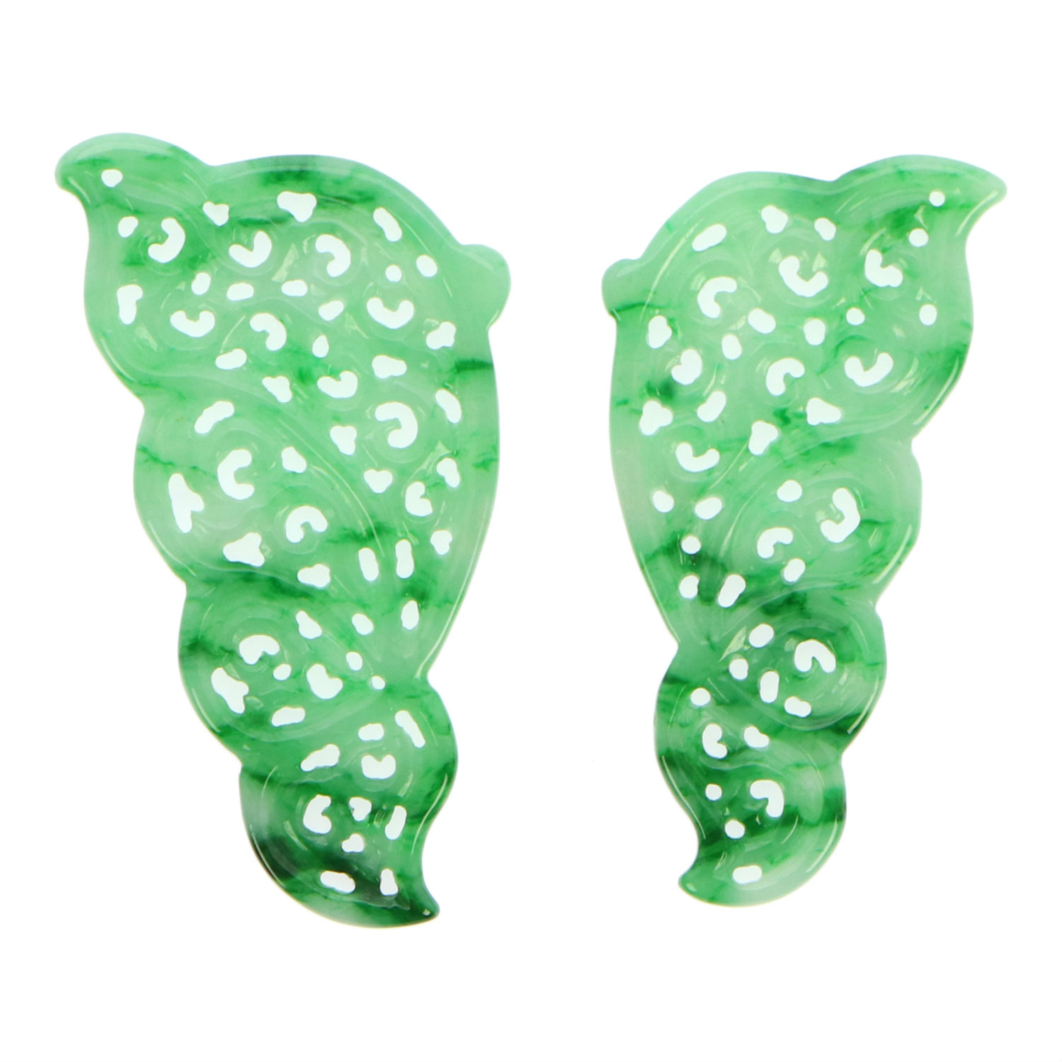 Sculpted into a butterfly-shaped silhouette, this pair of green jadeite jade earrings will be loved and cherished by all feminine and sophisticated ladies. This pair features beautifully handcrafted swirl-like carvings that best exhibits the varying hues and luster of this natural green jadeite. Polished and elegant, these accessories will look incredible with a floral chiffon gown.