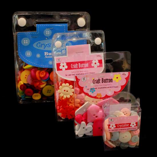 Showcased here are buttons of varying shapes, sizes and colors. The buttons are tidily packaged in transparent bags for easy storage and organization. These bright colored buttons are perfect for sewing, stringing, counting, sorting or gluing.