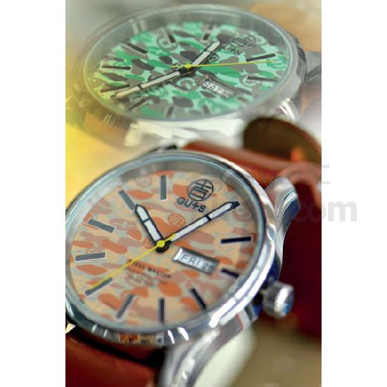 This high-end military series is made of steel. The dial is formed by camo pattern with the brand logo interestingly hidden inside. 50m-water-resistance, double date indicator and leather NATO strap make the watch even more professional and high-class.