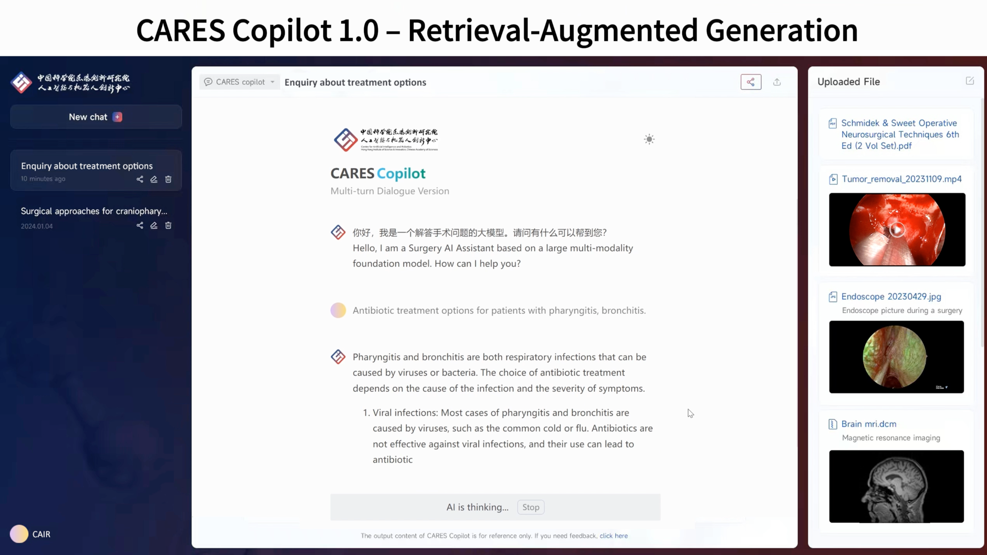 Equipped with a 100K context window for efficient understanding and analysis, CARES Copilot 1.0 can handle complex surgical materials exceeding 3000 pages, providing significant practical value for the training and education of young medical professionals. Furthermore, the system can quickly and accurately retrieve information from surgical teaching materials, expert guidelines, medical literature, and other professional documents, thanks to its deep retrieval functions, ensuring highly credible and traceable responses. Tests demonstrate that the system can retrieve information from datasets of over a million records within few seconds, with an accuracy rate of up to 95%.