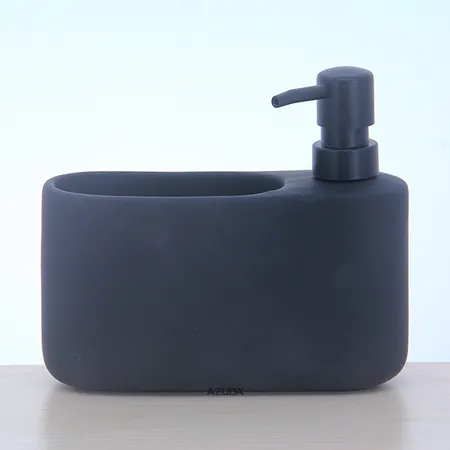 CERAMIC 2 IN 1 SOAP DISPENSER & TOOTH BRUSH HOLDER W/RUBBER PAINTED IN BLACK