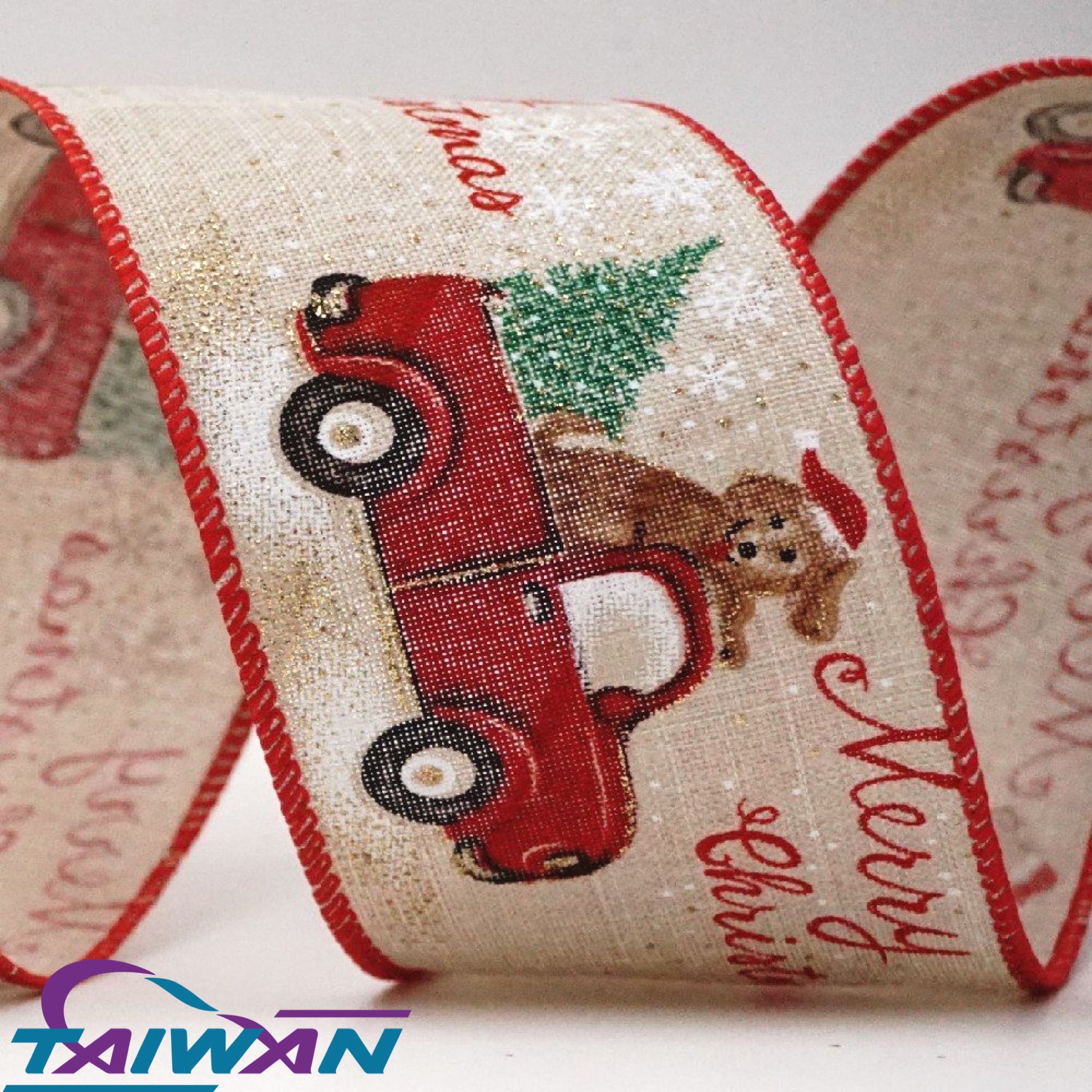 A lucky puppy gets a ride in a red, vintage pick-up truck. His Santa hat keeps him warm as snowflakes fall around him. This is a fun Christmas ribbon for any dog lovers and perfect for dogs’ design during the holiday season.