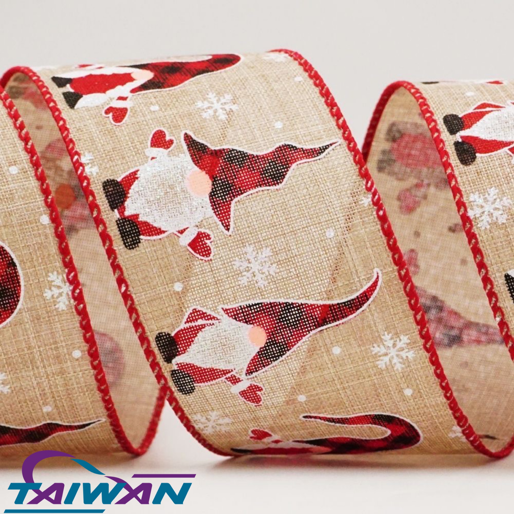 This Christmas Gnomes Ribbon has 2 fabric options and 4 colors to offer. The fabrics are flat velvet and faux burlap. This series is one size only - 2-1/2 inch. Each is cut and sewn with matte matching edge with wire that’ll help the bow maintain its shape.