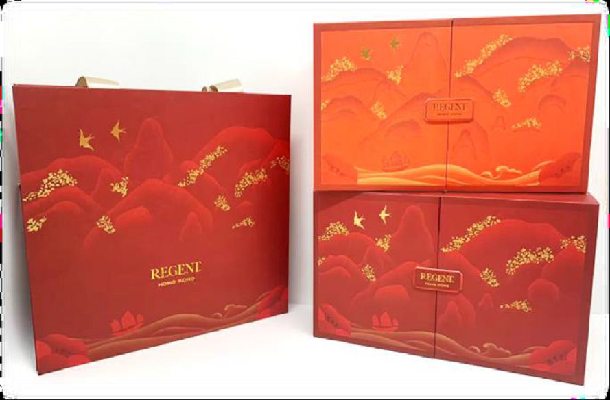 This set of gift boxes is mainly in red and gold colors. It depicts scenes of mountains and flying birds. It seems to encapsulate the magnificent landscapes of the country within the box, exuding elegance and luxury. It is as elegant and charming as a poetic painting.