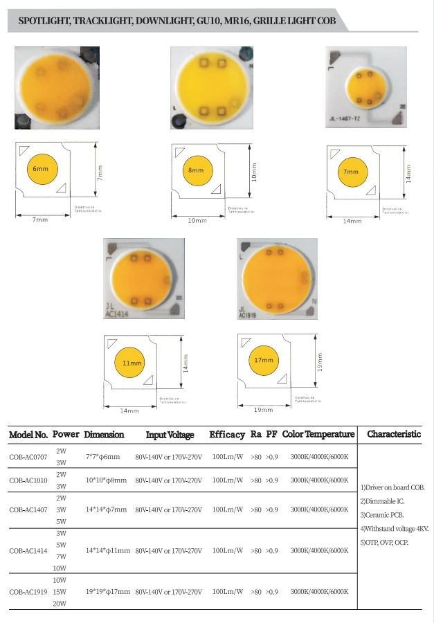 | COB-AC0707 | 2W | 7*7*φ6mm | 80V-140V or 170V-270V | 100Lm/W | >80 | >0.9 | 3000K/4000K/6000K | 1)Driver on board COB. 2)Dimmable IC. 3)Ceramic PCB. 4)Withstand voltage 4KV. 5)OTP, OVP, OCP. |