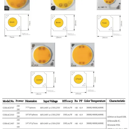 | COB-AC1407 | 2W | 14*14*φ7mm | 80V-140V or 170V-270V | 100Lm/W | >80 | >0.9 | 3000K/4000K/6000K | |