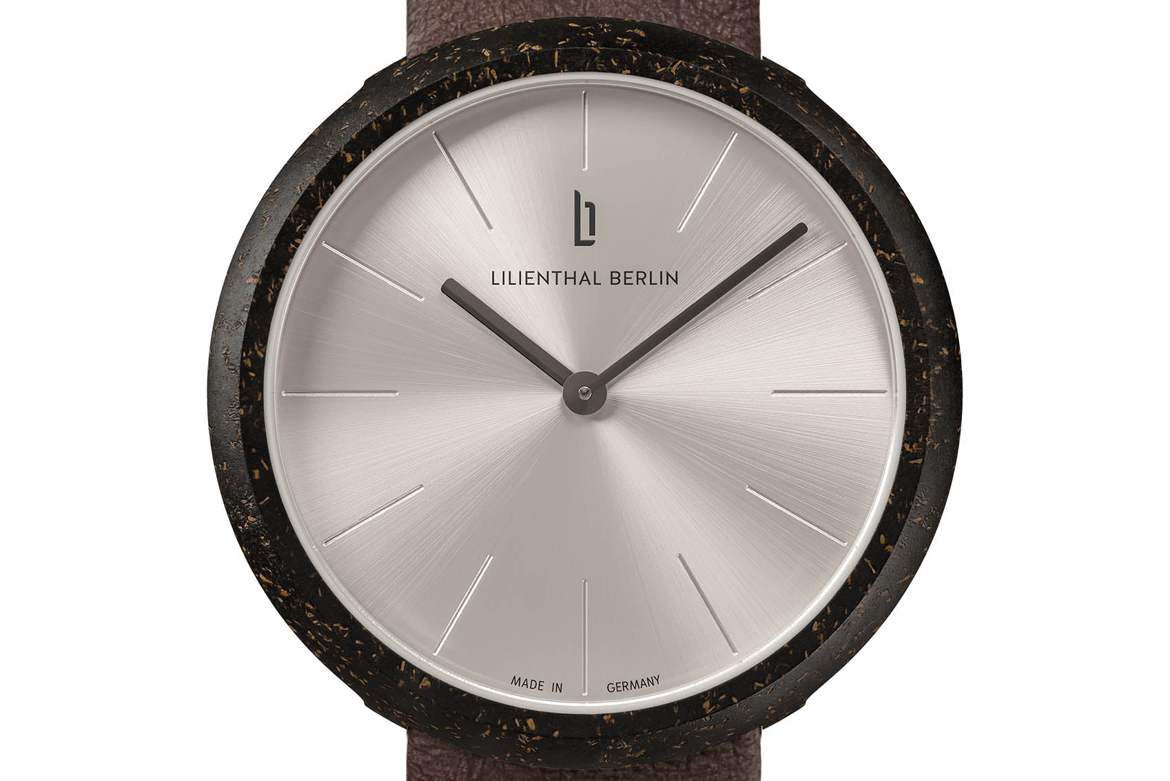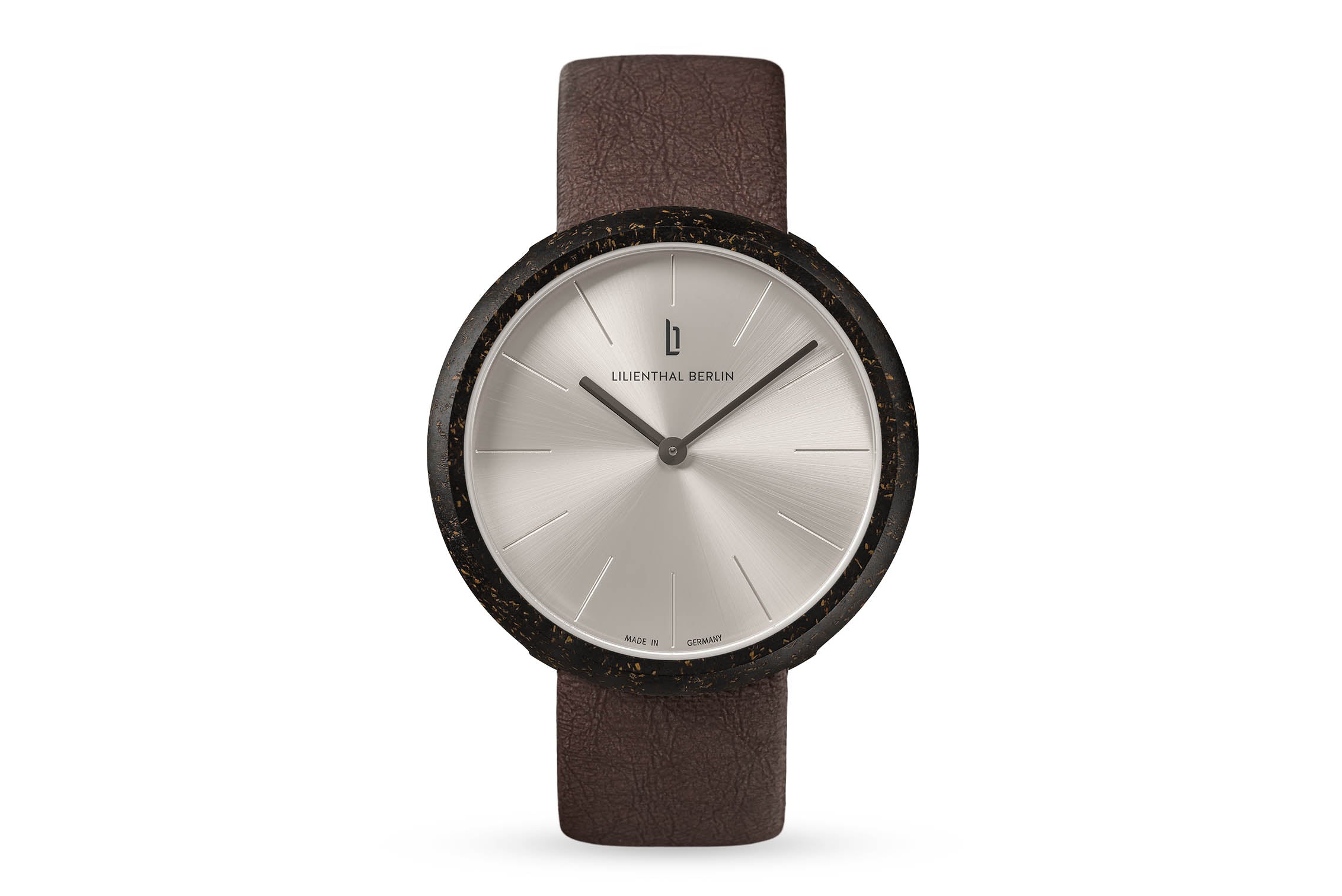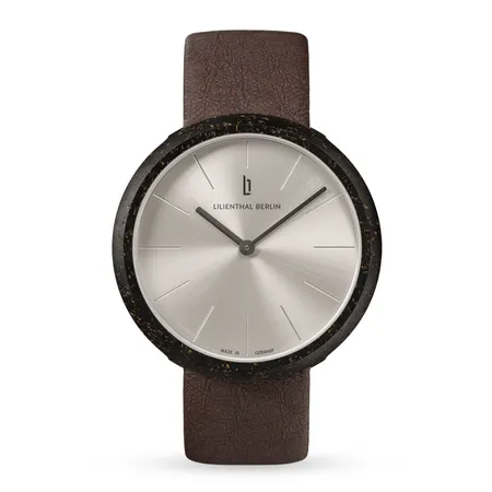 Made of recycled coffee grounds, the watch case is reminiscent of a coffee bean or a coffee cup, depending on how you look at it. The especially round, minimalist appearance of the watch was created using a special trick: the crown is completely recessed into the case back. The pure, straightforward design philosophy is greatly enhanced by the clean, silvery sunburst pattern of the watch face and neatly engraved hour marks.