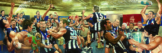The all-conquering 2010 Australian Football League Premiers Collingwood FC, are unveiled here in their moment of glory. The scene is the change rooms at the Melbourne Cricket Ground, October 2nd, when all the hard work and sacrifice is rewarded.