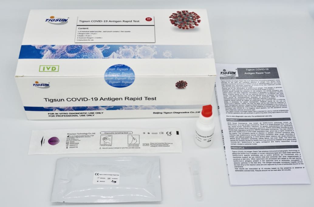 Beijing Tigsun COVID-19 Antigen Rapid Test employs Immunochromatography technology to detect the SARS-CoV-2 antigen in human respiratory secretion specimens with swab sample by Lateral Flow Method. It offers lab-quality results at the point of care testing with reliable performance in 15 minutes.