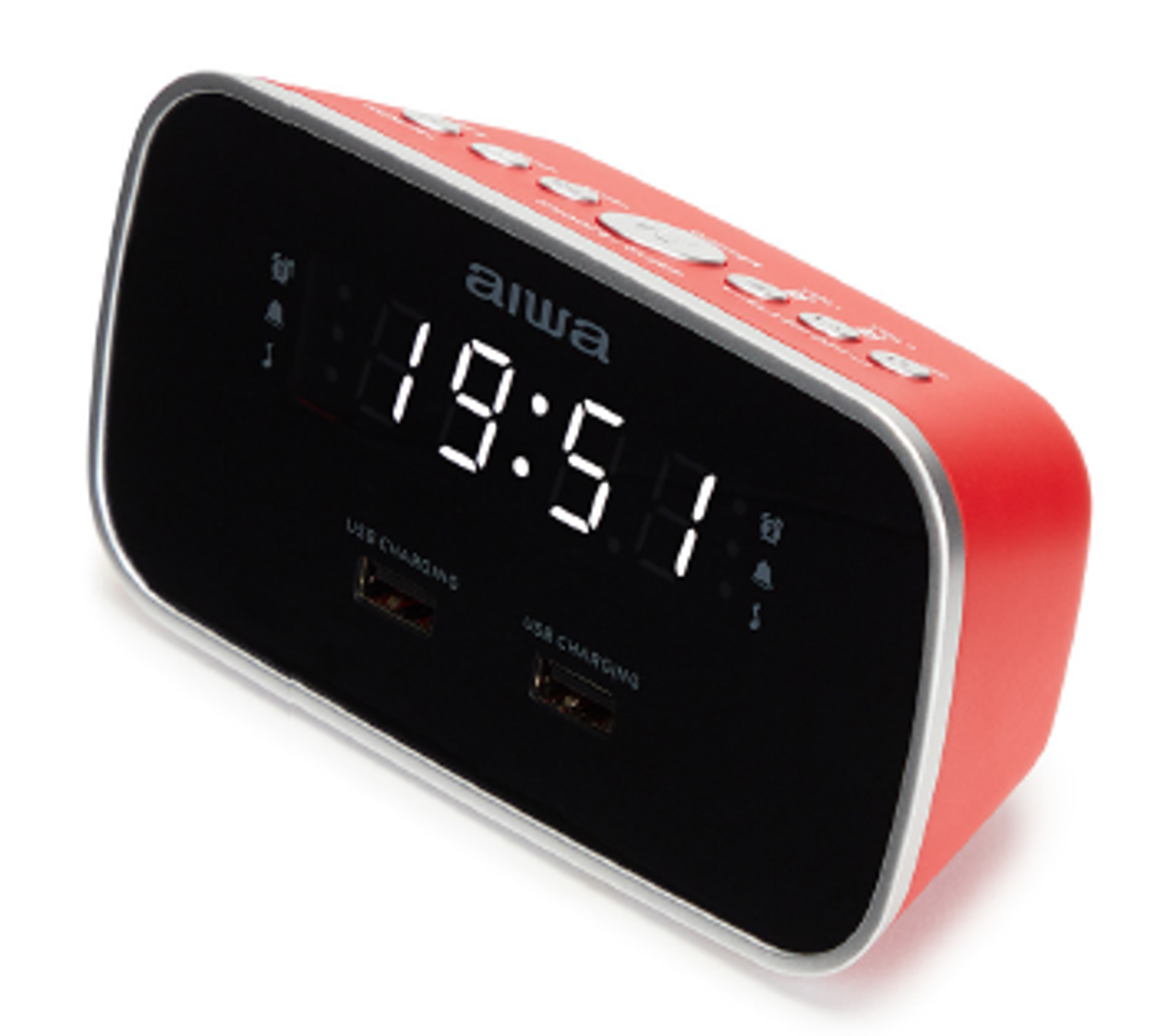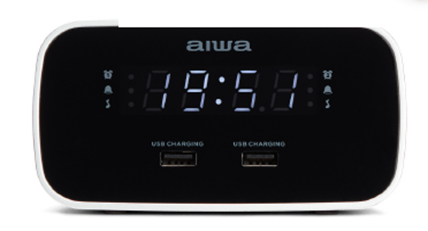 Alarm Clock Radio with a stylish, compact design featuring dual USB ports for charging, white LED display with dimmer, and digital FM tuner with 10 presets. Includes dual alarm with snooze/sleep functions, buzzer/radio options, digital volume control, AC adapter, and battery backup.