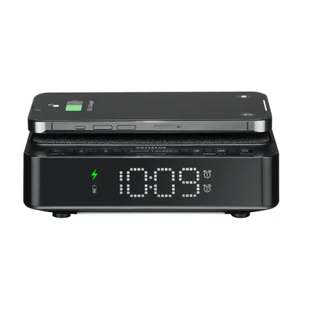 Alarm Clock Radio: 5W wireless charging for smartphones, FM PLL radio with 10 preset stations, and dual alarms with radio or beep wake options.