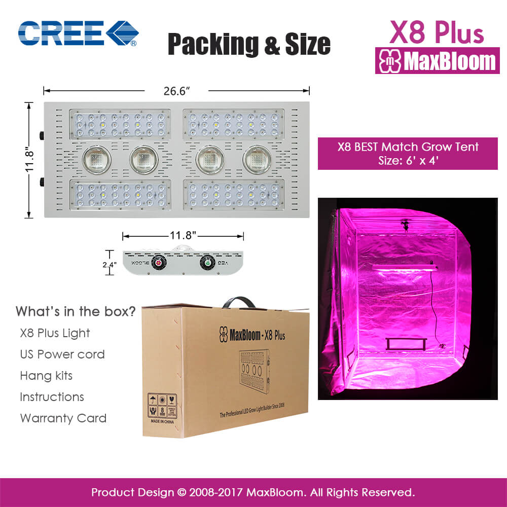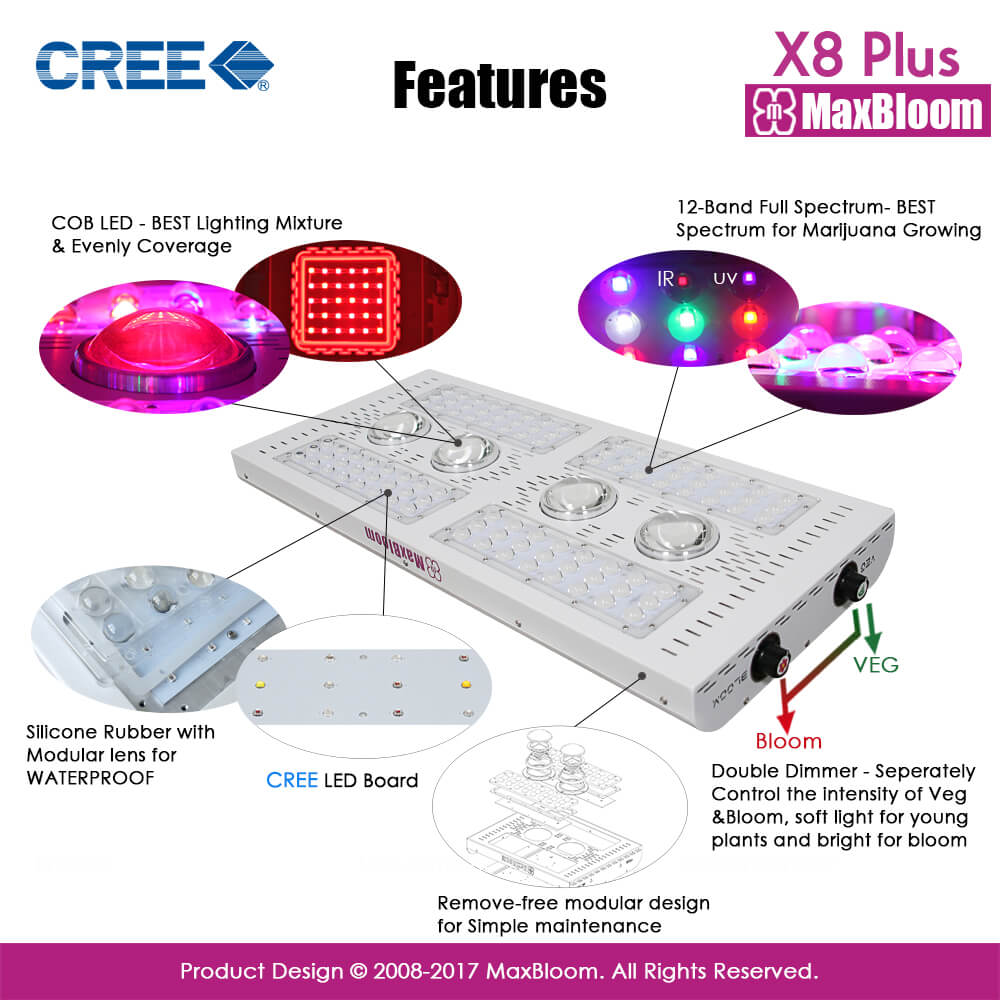 X series LED grow light COB dimmable with single&COB LEDs mixed for BEST lighting layout, remove-free modular design for easy maintenance, and optical lens with silicone rubber for WATERPROOF.