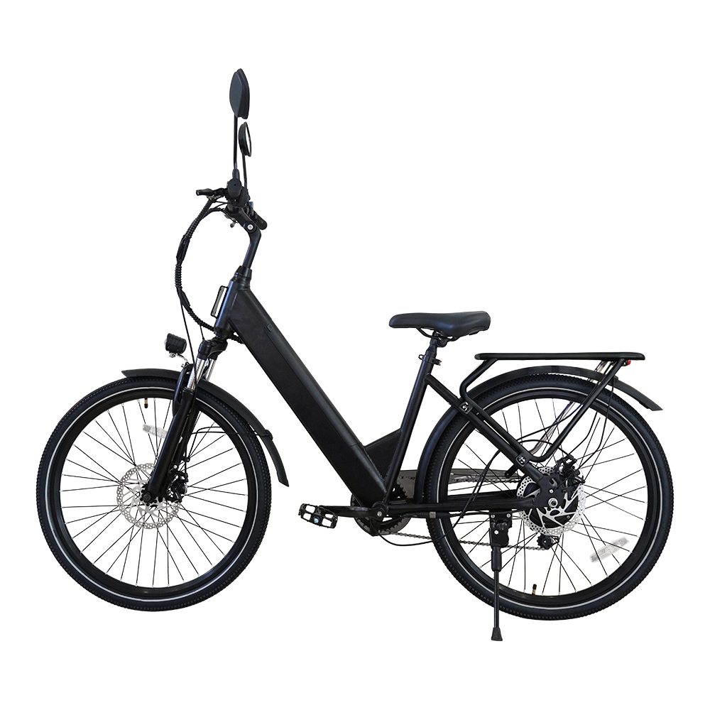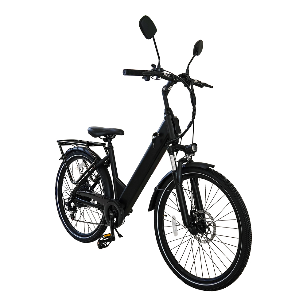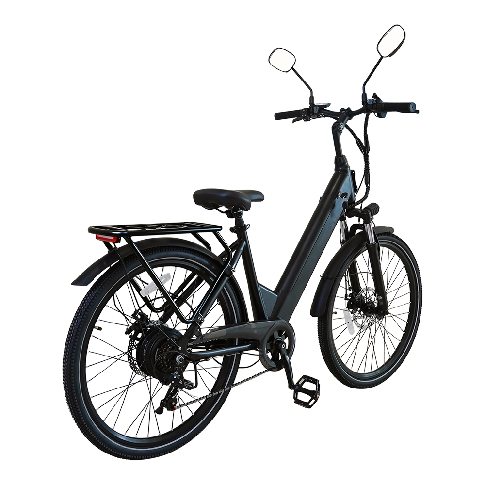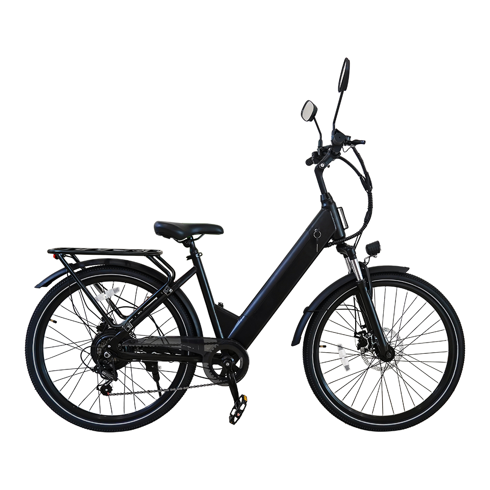 This model is the CS-C2, suitable for women. It features 26-inch inflatable tires and a 350W motor, reaching a top speed of 25 km/h. The battery has a capacity of 10.4Ah, providing a maximum range of 45 kilometers. It has a sturdy iron frame with a maximum load capacity of 120 kg. It features bright headlights and red taillights, with the taillights also functioning as turn signals. With 7-speed gear shifting, it offers easy riding, and the front wheel is equipped with shock absorbers for both safety and comfort. Let's go for a ride!
