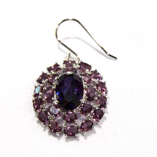 If you are looking for earrings to match with your evening looks, the featured earrings are the perfect choice. The earrings feature a big purple CZ stone in the center with smaller ones surrounding it. The stones are glossy and clear.