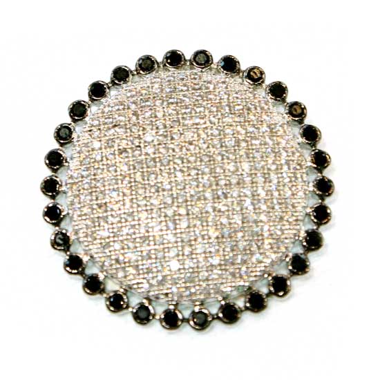The presented CZ pendant is designed in a coin shape that is surrounded with black stones. It is finely paved with petite CZ stones to present an elegant and pricey look. This CZ pendant is an artistic and glamorous piece to wear with evening dresses.