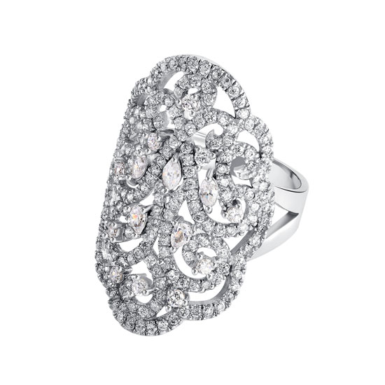 This CZ ring is mounted on 925 silver. The ring is set with different shapes of sparkling white cubic zirconia stones in rhodium plating. With a chic design, this ring can be mixed and matched with different types of evening gowns and is suitable for different occasions.