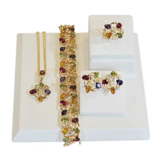 This is a jewellery set which features with CZ stones in 5 different colours. There are thin gold connections among stones to construct an openwork design.