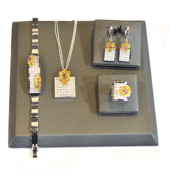 This is a jewellery set which features with cubic ziconia (CZ) stones in different colours. Each of the jewellery pieces has a flower attached on a rectagular base filled with transparent stones.