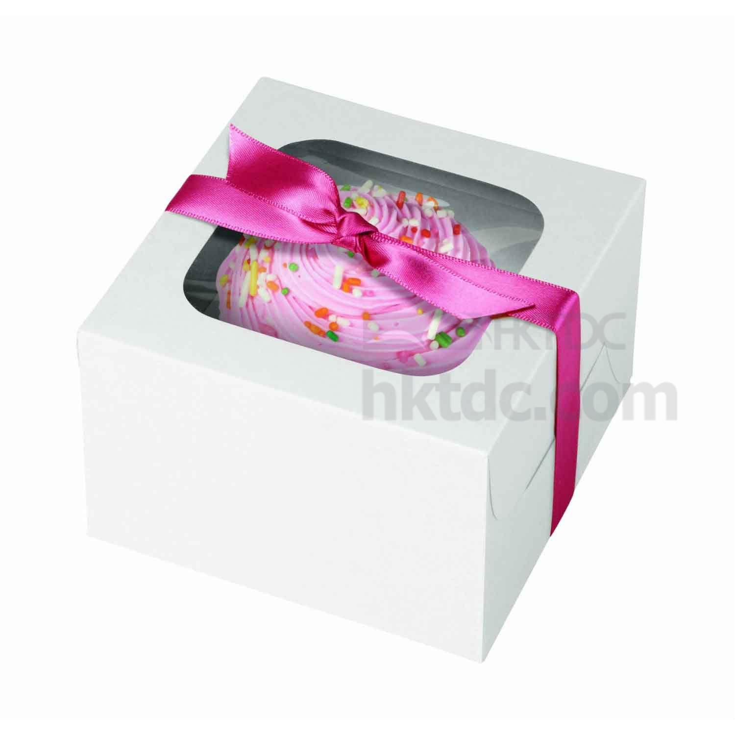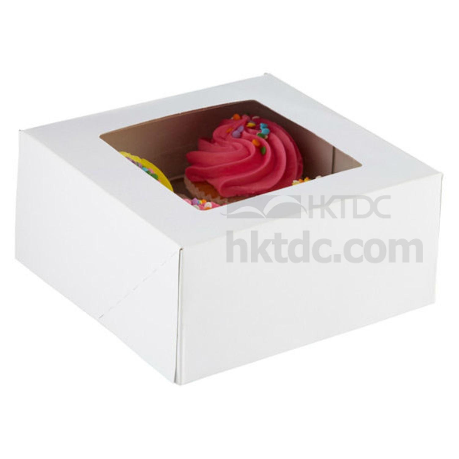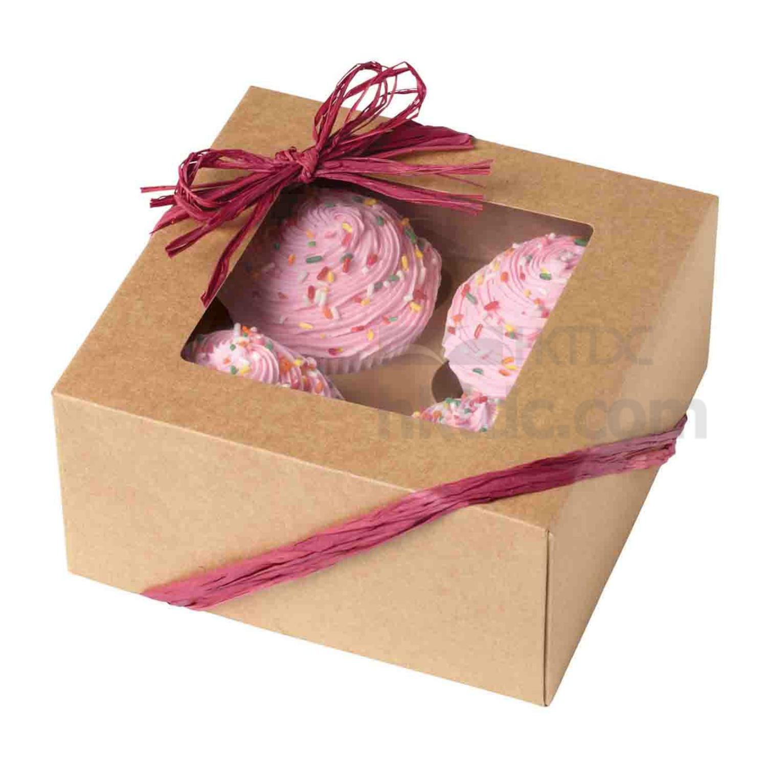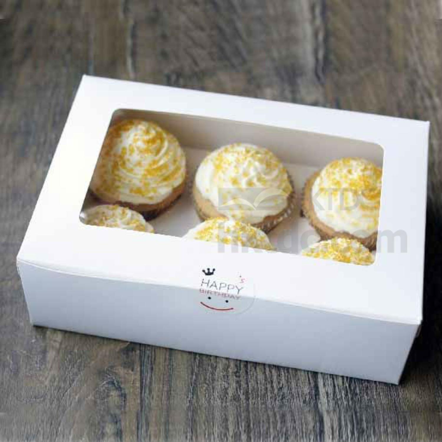 Showcased is a plain bakery box in a rectangular shape. It features a transparent window on the flap to give a decent display to the content. Coming completed with an insert, it holds 6 standard cupcakes perfectly and keeps them in place during transportation.