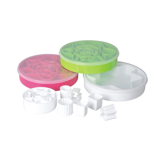 The shaped cake cutters are neatly kept within a round-shaped case. The cutters come in a range of appealing shapes, including the teddy bear, human, square, circle, corrugated edge, etc. The compact case allows the whole set easy to be kept in cabinets after use.