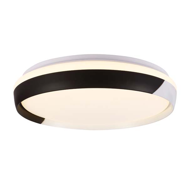 This is a circular ceiling light. The main body is in black and white. There is a soft glowing light strip around the edge of the lamp body, and the overall style is simple and modern.