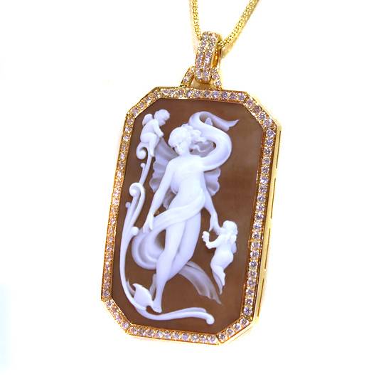 This pendant has a shell cameo in high relief with white diamonds. It is made by the company's own design with high uniqueness. This handmade pendant has diamonds of 2 carats for embellishments along the edge and the bail.