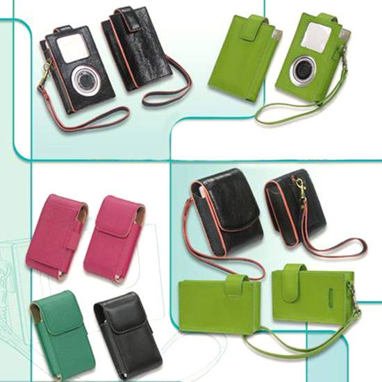 These are camera cases made of synthetic leather. Each of the upper ones has a hole for showing the lens so that the camera user can keep the camera in the case when taking photos.