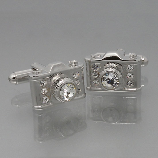 This is a pair of platinum cufflinks that is designed in a camera shape for a unique touch. This pair of camera cufflinks is crafted with white Swarovski crystal stones for elegance. This pair of cufflinks adds a glamorous touch to your outfits.