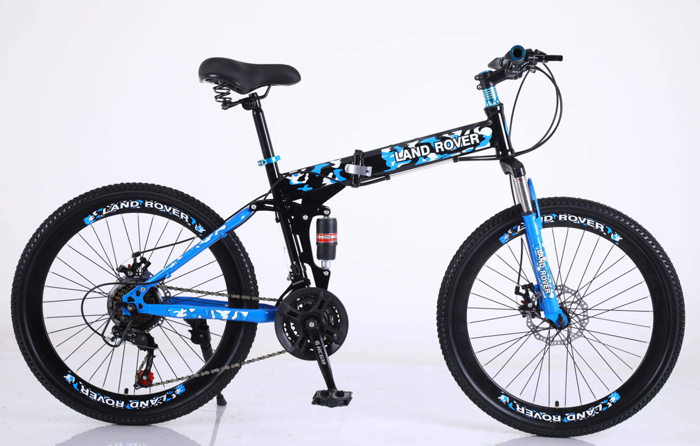 High carbon steel folding soft tail frame, camouflage sprayed inner sticker, double shock absorption, double disc brake, aluminum alloy knife, Dubai special widened seat, domestic transmission system (30 finger derailleur and 50 rear derailleur), Hengqi/Huanyu/Ju Win 26×195 tires, natural rubber inner tube