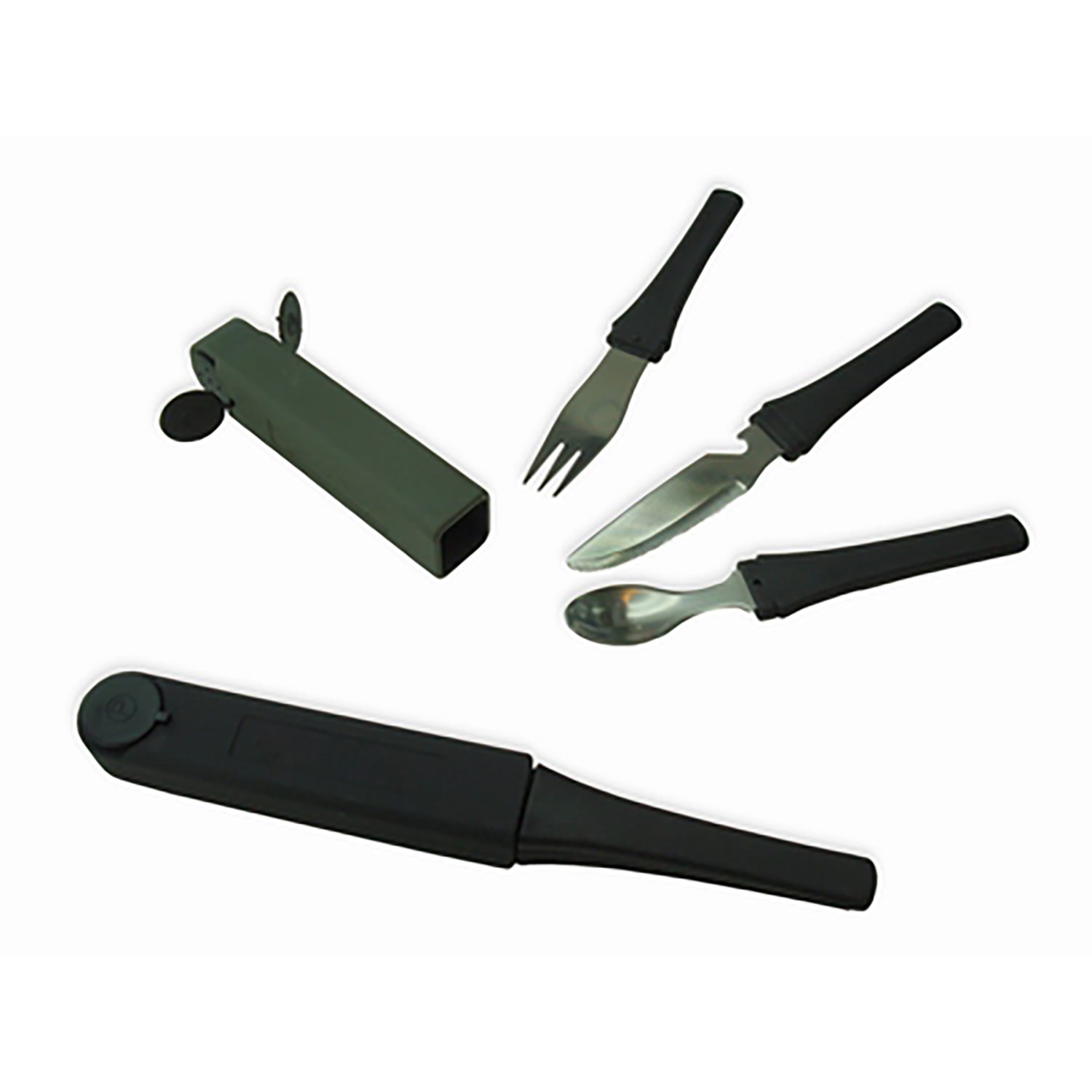 Camper's dining utensil kit equipment with salt and pepper holder includes the following features: