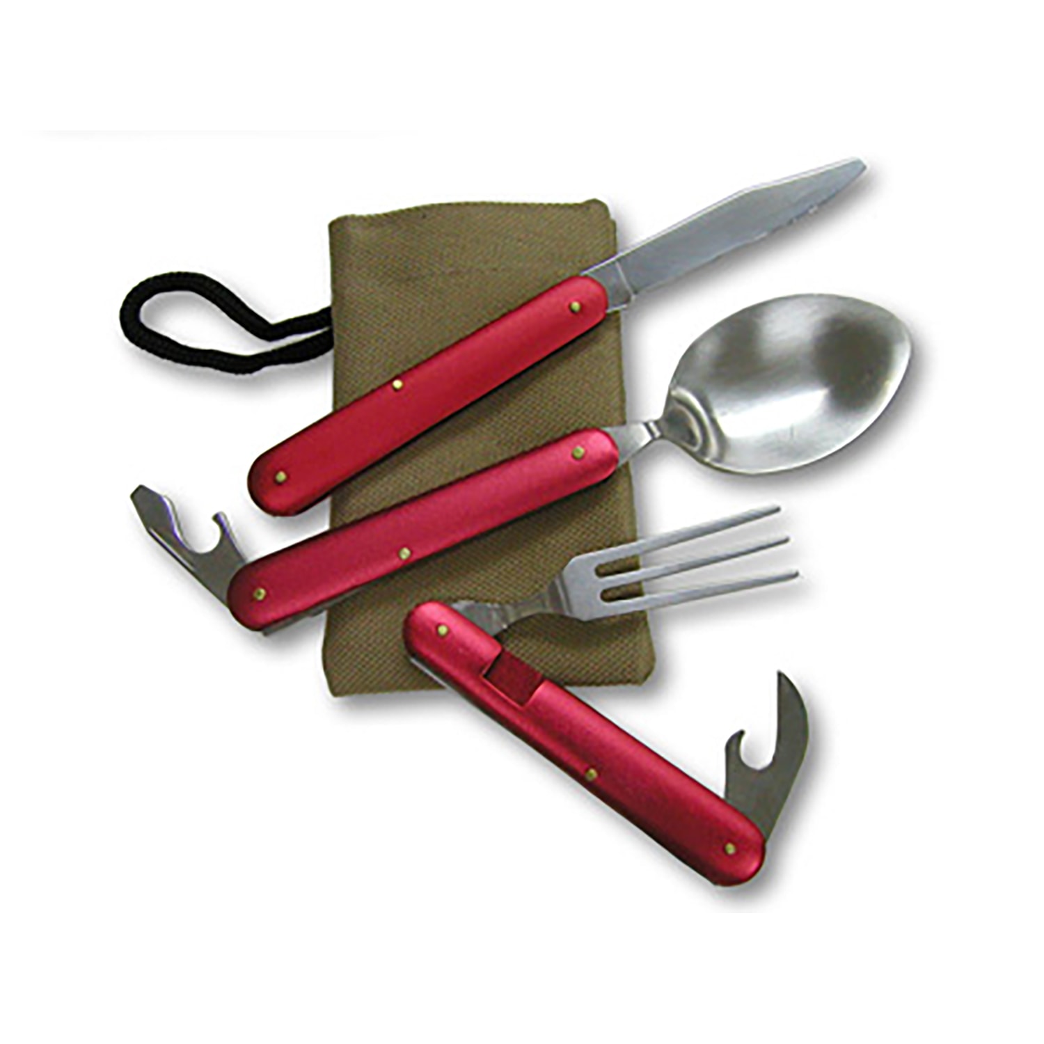 Camper's dining kit / travel utensils with carrying nylon pouch includes the following features: