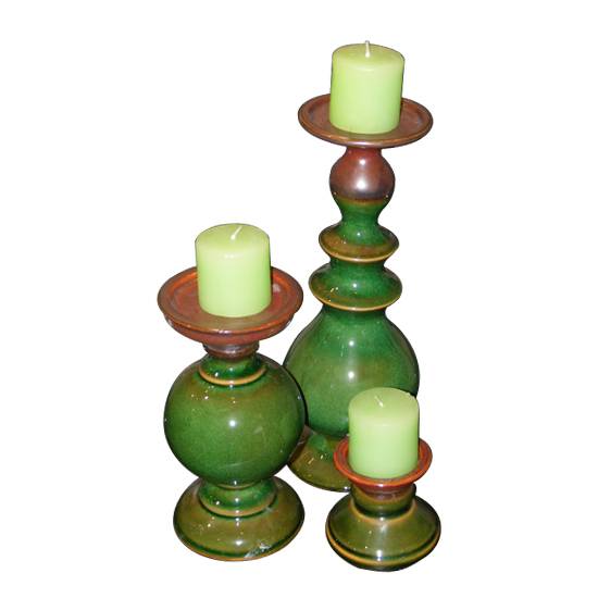 These are candle holders. These candle holders are suitable for holding different sized candles. The exterior design of these candle holders are in bottle green and reddish brown tone.