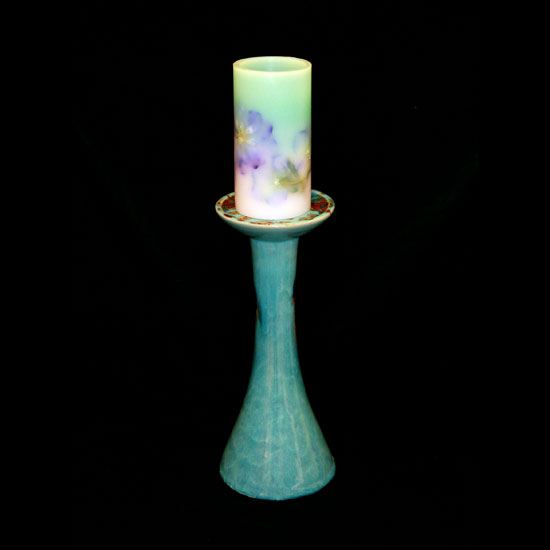 Showcased is a desktop candle holder crafted in a graceful curvy shape. The ceramic holder is colored in peacock blue with a gloss finish. The flat top features exotic paints to harmonize with the candle.