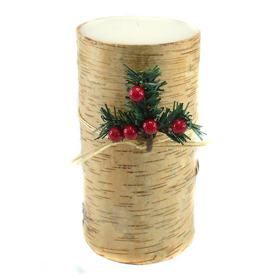 The featuring item is a candle pillar for home and interior decorations. The brown pillar holder has wood texture and is filled with white wax. Tied with a plant embellishment on front, the candle is ideal for adding a festive mood to the surroundings.