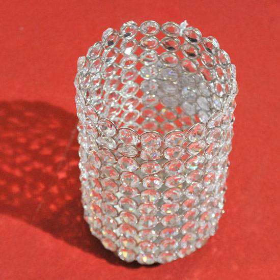 The featured item is a candlestick holder in unique design. The whole of it is supported by metal rings lined together. Crystals are further set on each metal ring.