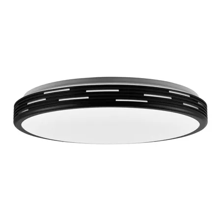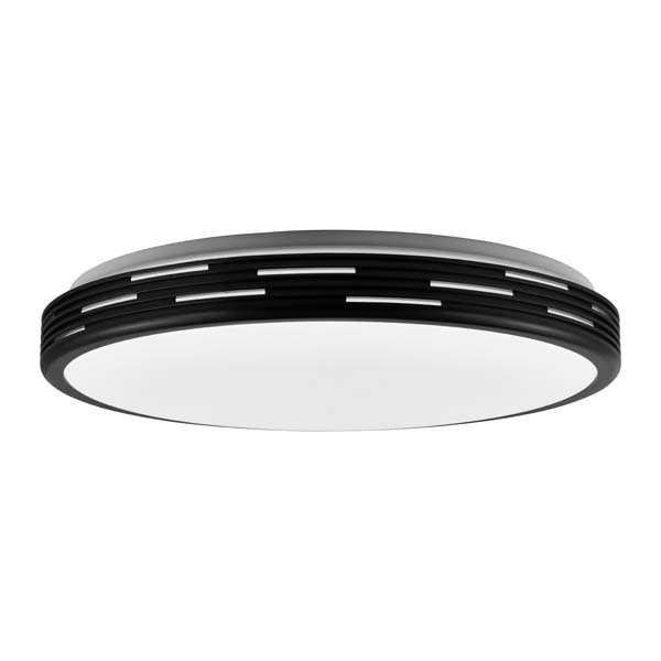This is a round ceiling light. The main body of the lamp is circular. The frame part features a black - and - silver color scheme, with strip - shaped hollow designs on the black frame. The white lampshade area in the middle is used for lighting. The overall style is modern and simple, and it is suitable for installation in indoor spaces such as living rooms and bedrooms to provide lighting.