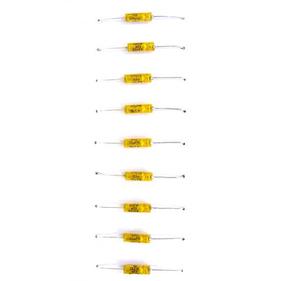 The featured item is a tantalum capacitor. They are made in the same form of a fuse and in yellow colour.