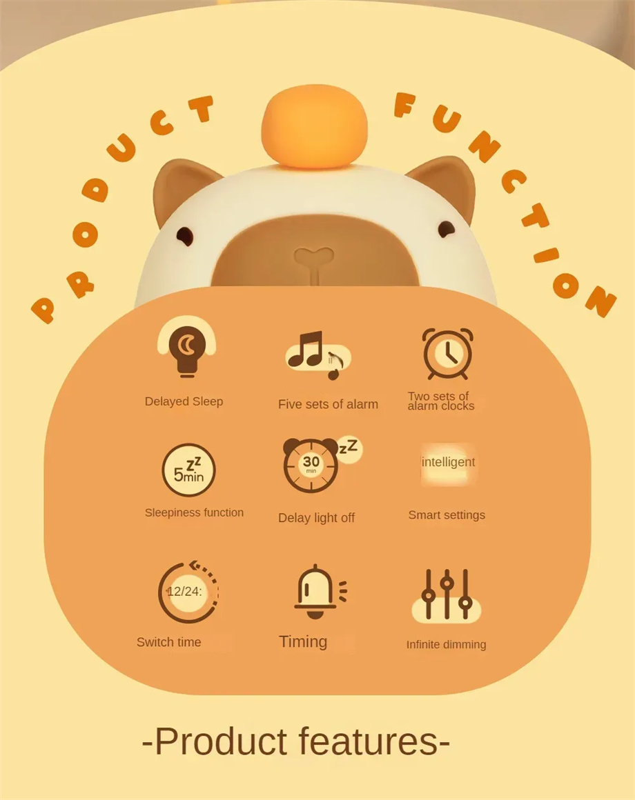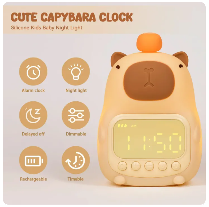 Cute 2-in-1 capybara silicone night light + digital alarm clock. Soft warm light, infinite dimming – helps kids fall asleep peacefully and wake up on time.