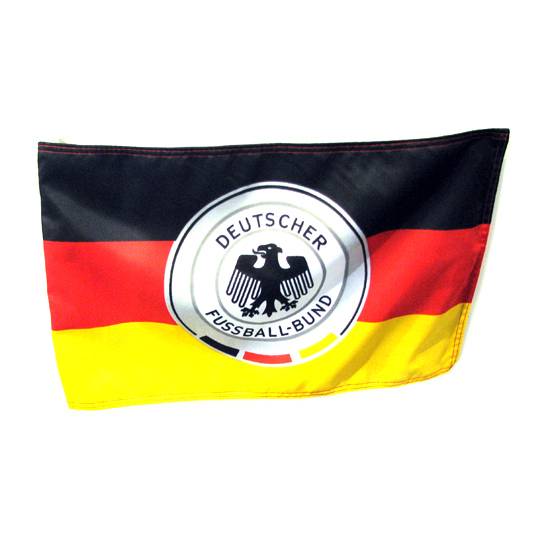 This is a car flag. The flag is made with fabric or plastic according to the need. The flag is printed with a German national flag with some symbols on it.