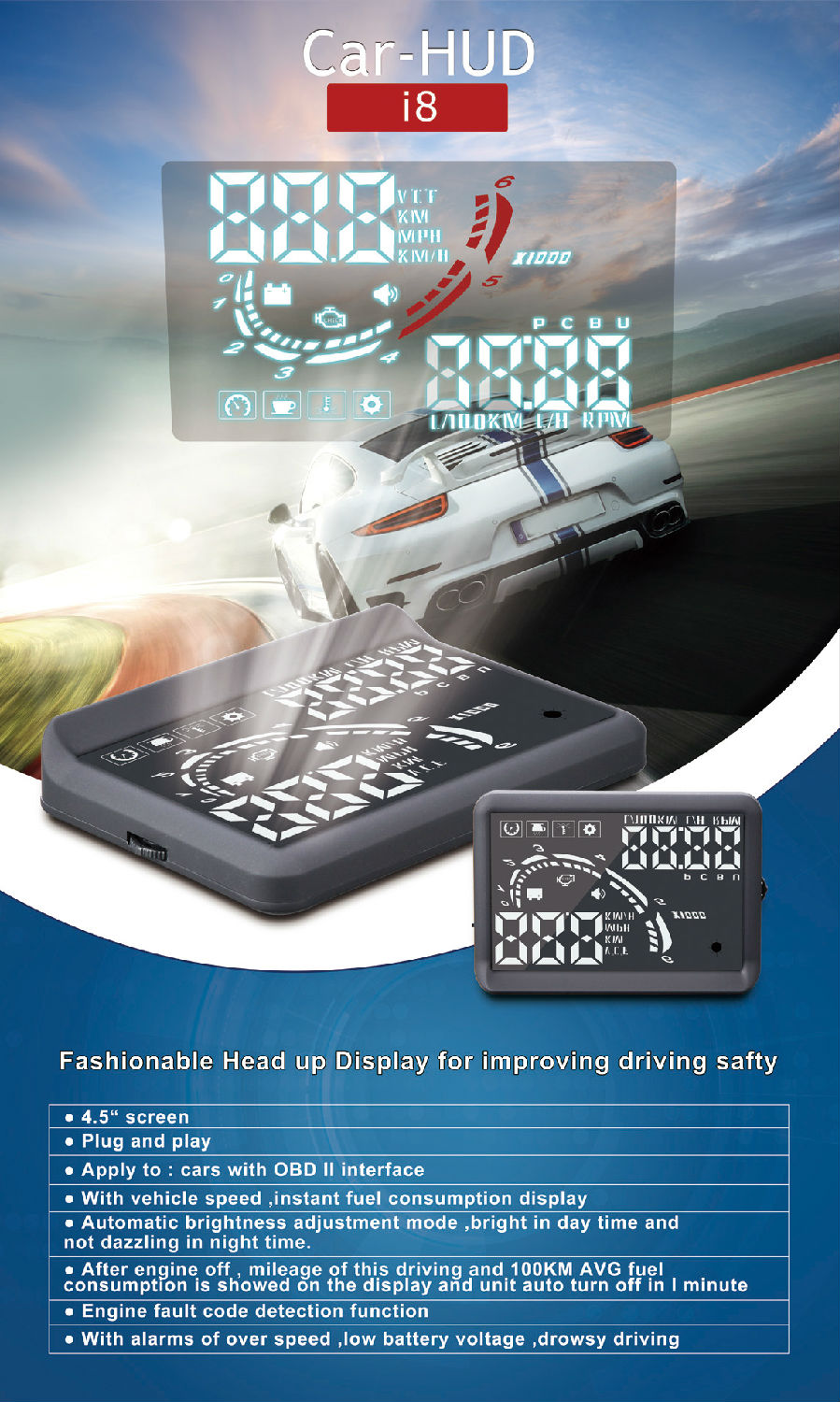 • 4.5" screen, plug and play, apply to:cars with OBD II interface with vehicle speed,instand fuel consumption display