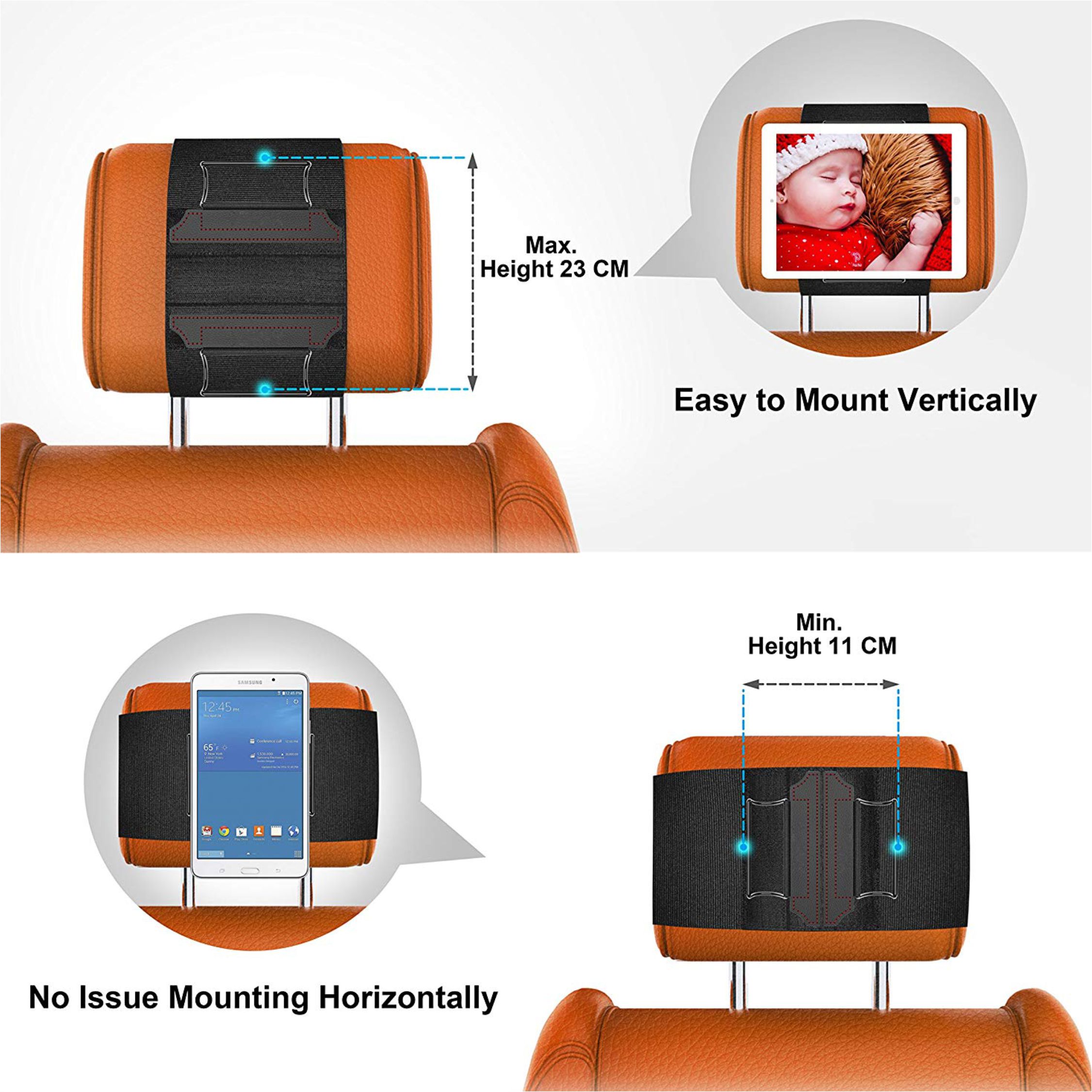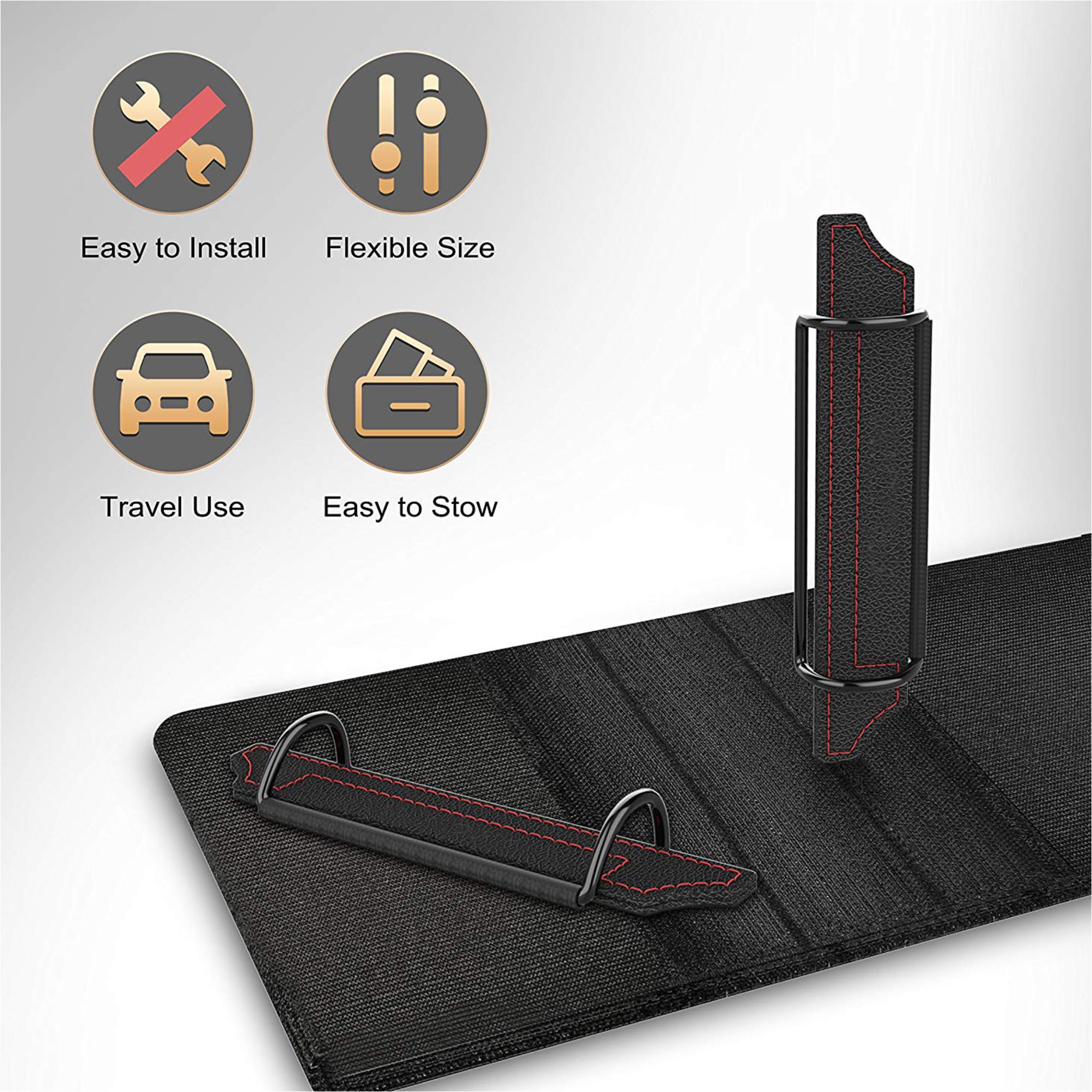 【Secure, Safe and Durable】Constructed from long-wearing and stain resistant elastic hook and loop tape with metal clips to hold your portable device securely in place, which prevent the tablet from sliding or shifting when going on a speed bump or high motion.
