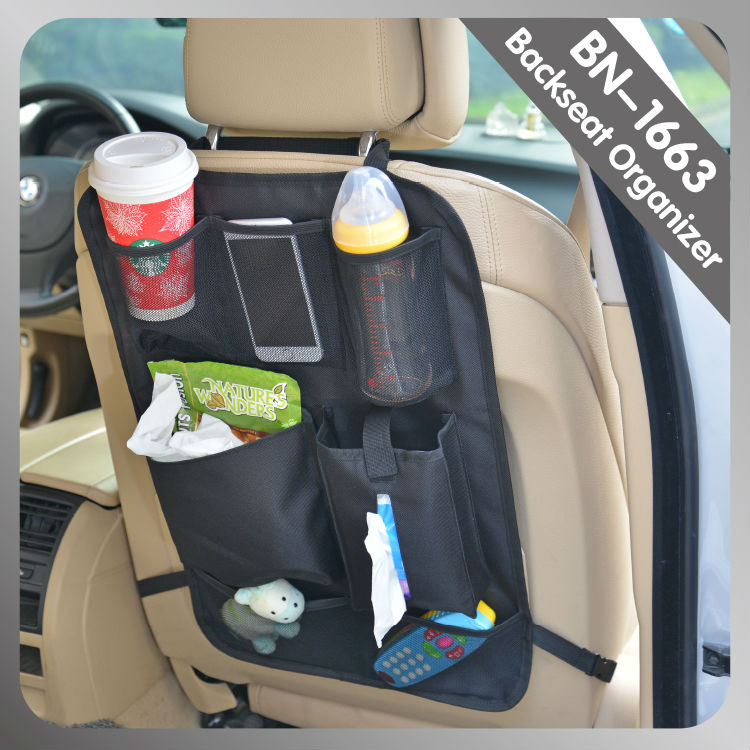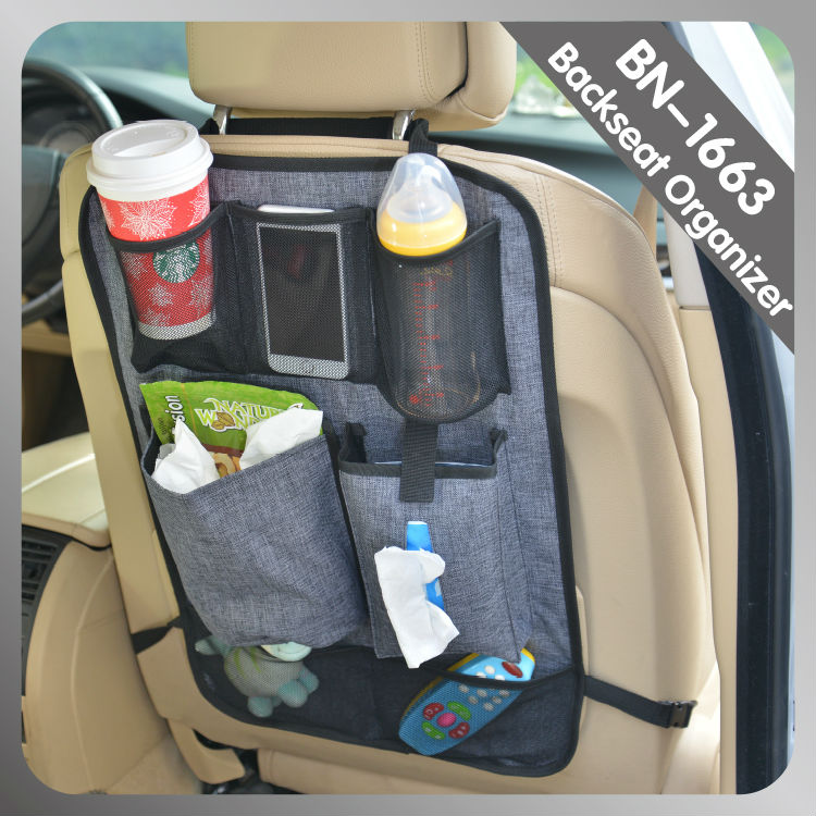 2. Trash bag design to make a place to put rubbish during traveling, and it can put on and off. 3. Adjustable top and bottom ties to keep securely in position.