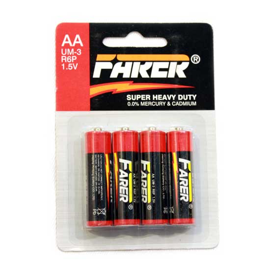 The displayed carbon battery features an AA R6P 1.5V design. It is nicely enclosed in a black and red covering for safety. This high performance carbon battery contains 0% mercury and cadmium.