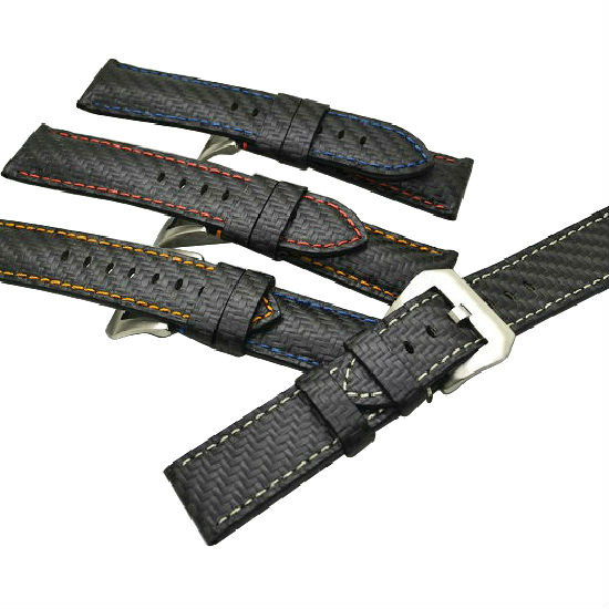 -Gents sporty genuine carbon fibre straps -match with sporty, fashionable, trendy gents analogue or cronograph watch -fashionable thick stitch, like red, orange, blue, white, yellow stitch -sharp of strap can be flat or padded -Genuine carbon fibre top -Caoutchouc black lining