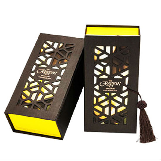 Featured here is a box with an oriental design. It has elegant patterns on the surface and has a tassel attached to the side. This box is excellent for using as a gift box.