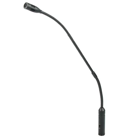 A gooseneck microphone uses a high-sensitivity condenser element with EMC shielding and a cardioid pattern for clear, focused sound. It features a flexible two-section gooseneck and a low-cut switch for versatile use. Powered by 48V phantom power, its LED indicator lights up when active. Finished in black and 50cm long, it’s ideal as a podium microphone, lectern microphone, or PA system microphone in public systems.