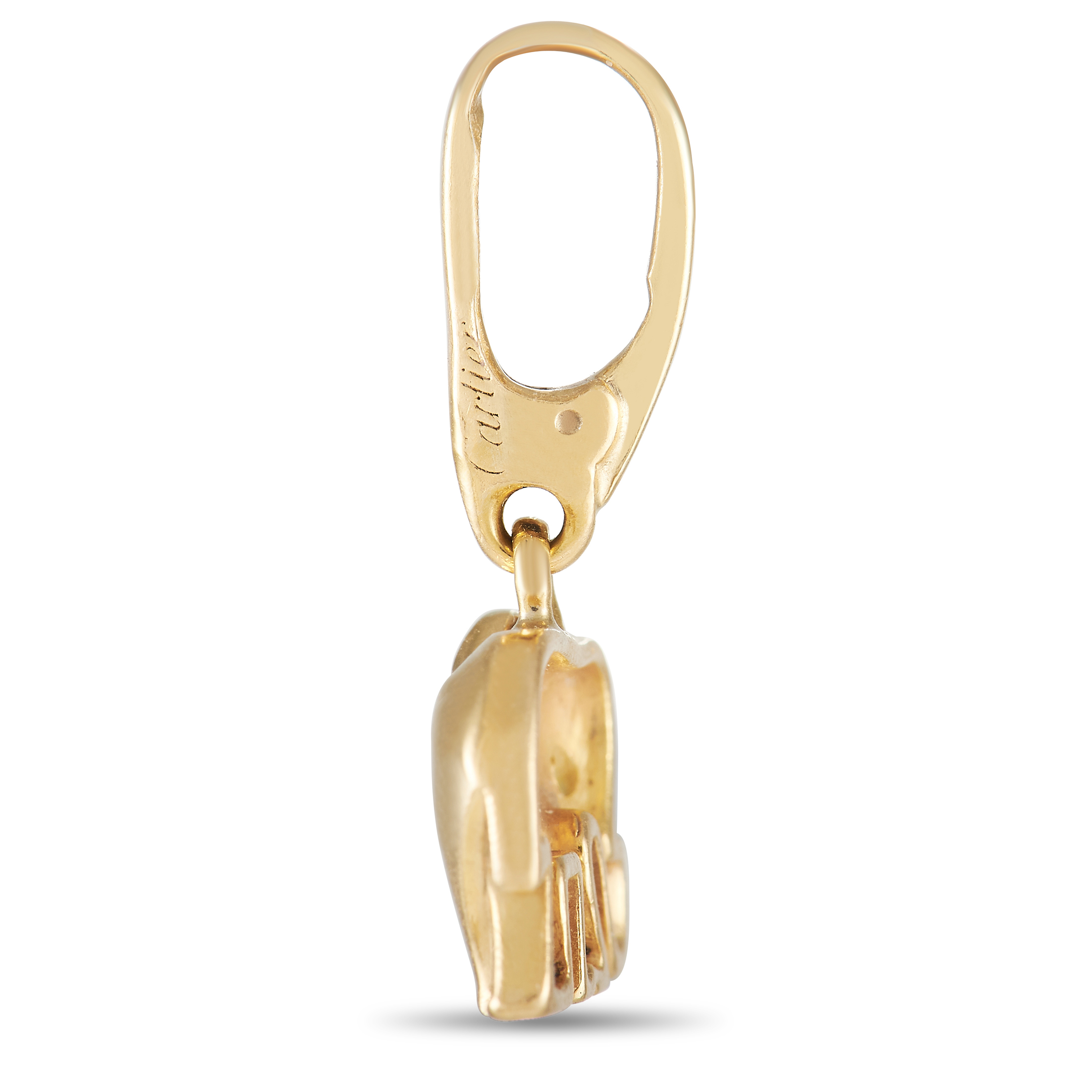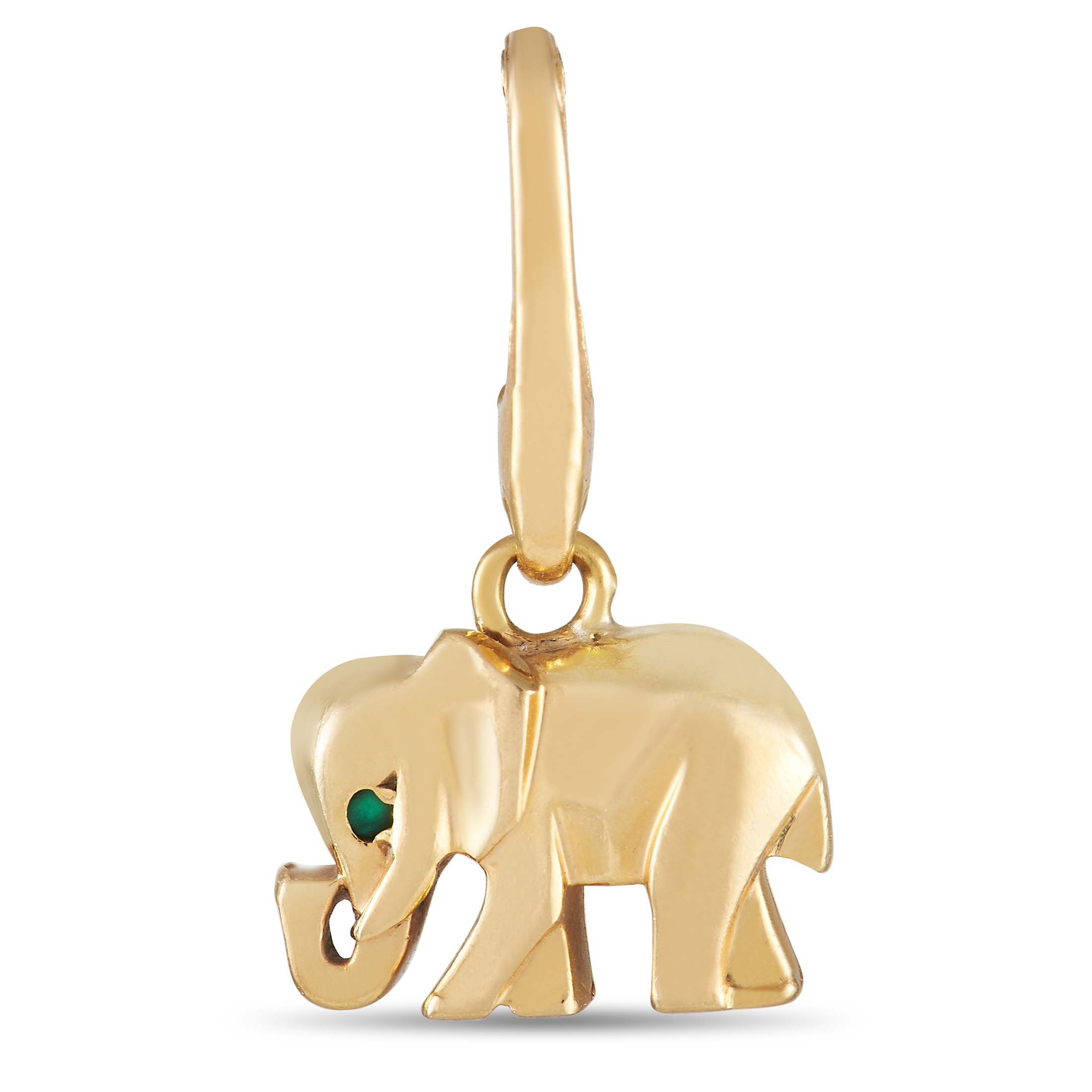 This Cartier Candy charm will make any chain more elegant. Lustrous 18K Yellow Gold elevates the sleek elephant-shaped design, which measures 1” long and 0.65” wide. A green gemstone “eye” provides the perfect finishing touch.