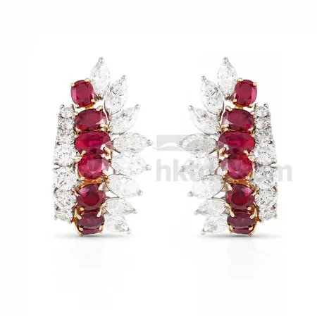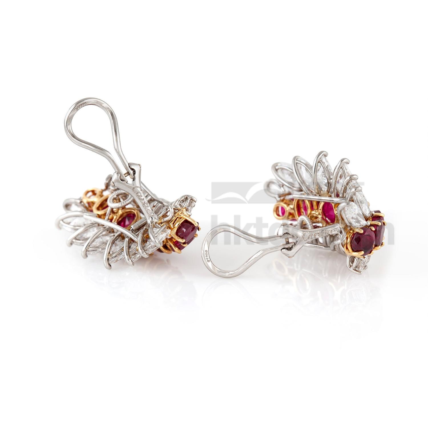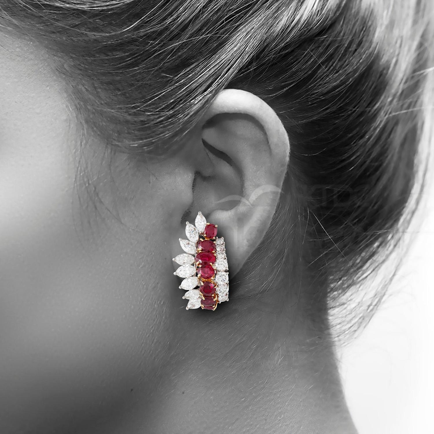 Cluster ear clip earrings, finely crafted in platinum and 18 k yellow gold, featuring 14 Burmese rubies, weighing a total of 12.46 carats, surrounded by brilliant and marquise cut diamonds, weighing a total of 11.11 carats. Signed and numbered by Cartier Paris.