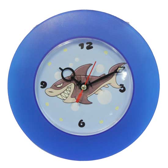This decorative rounded blue clock makes an adorable addition to any children's room. The analog clock features a large and easy-to-read face with distinct indexes. Bright blue color with a cartoon shark picture showcases an ocean motif.